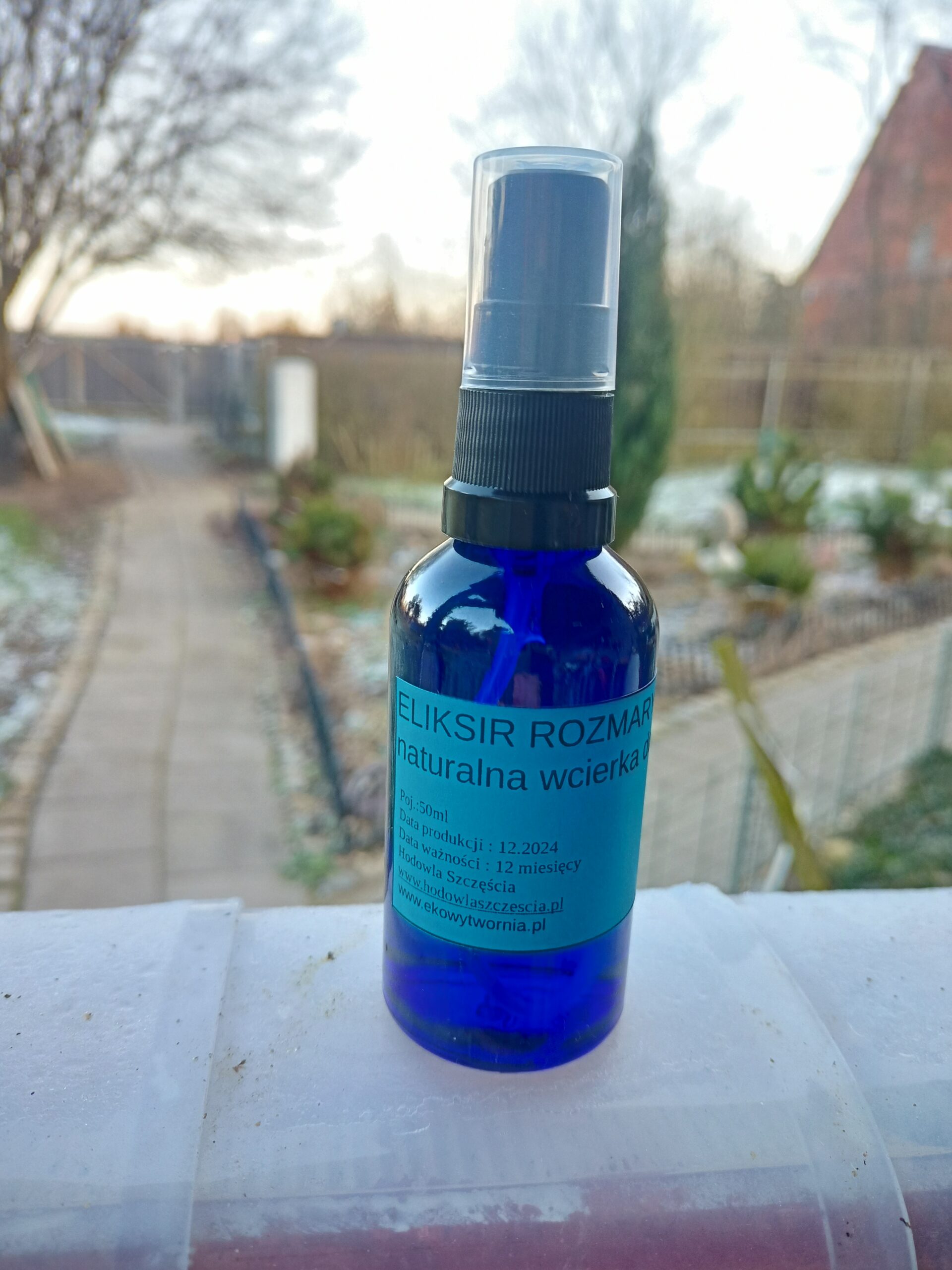 Przed myciem obficie spryskaj skórę głowy i włosy, załóż foliowy czepek, a po upływie godziny zmyj miksturę ulubionym szamponem. Stworzony przez nas kosmetyk można stosować także jako tzw. wcierkę. Na wilgotne i czyste włosy aplikujemy niewielką ilość eliksiru z rozmarynu i pozostawiamy do wyschnięcia